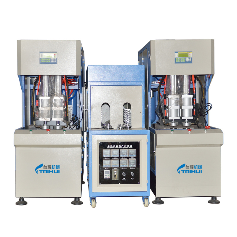 TH-5分為吹瓶主機(jī)以及旋轉(zhuǎn)紅外線加熱器兩部分。因?yàn)槠颗叩钠勘诒容^厚,普通的加熱系統(tǒng)達(dá)不到理想的瓶胚加熱效果,而紅外線加熱器可以穿透瓶胚內(nèi)外,并且加熱持久,均勻,保證了很好的成型質(zhì)量。
